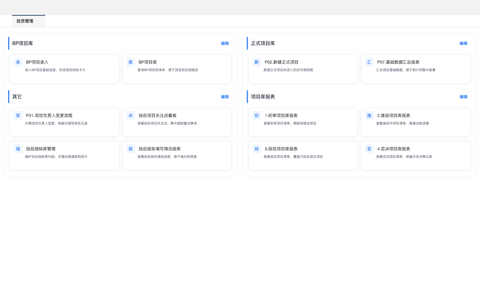 集中展示投资管理、基金管理、综合管理与信息中心四类核心入口,覆盖项目推进、基金台账、日常流程和资料检索等高频业务场景。