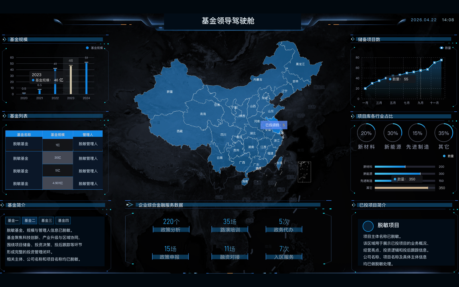 轮播展示基金领导驾驶舱与财务数据查看界面,覆盖基金规模、项目储备、行业分布、综合服务数据和财务指标分析等经营管理场景。