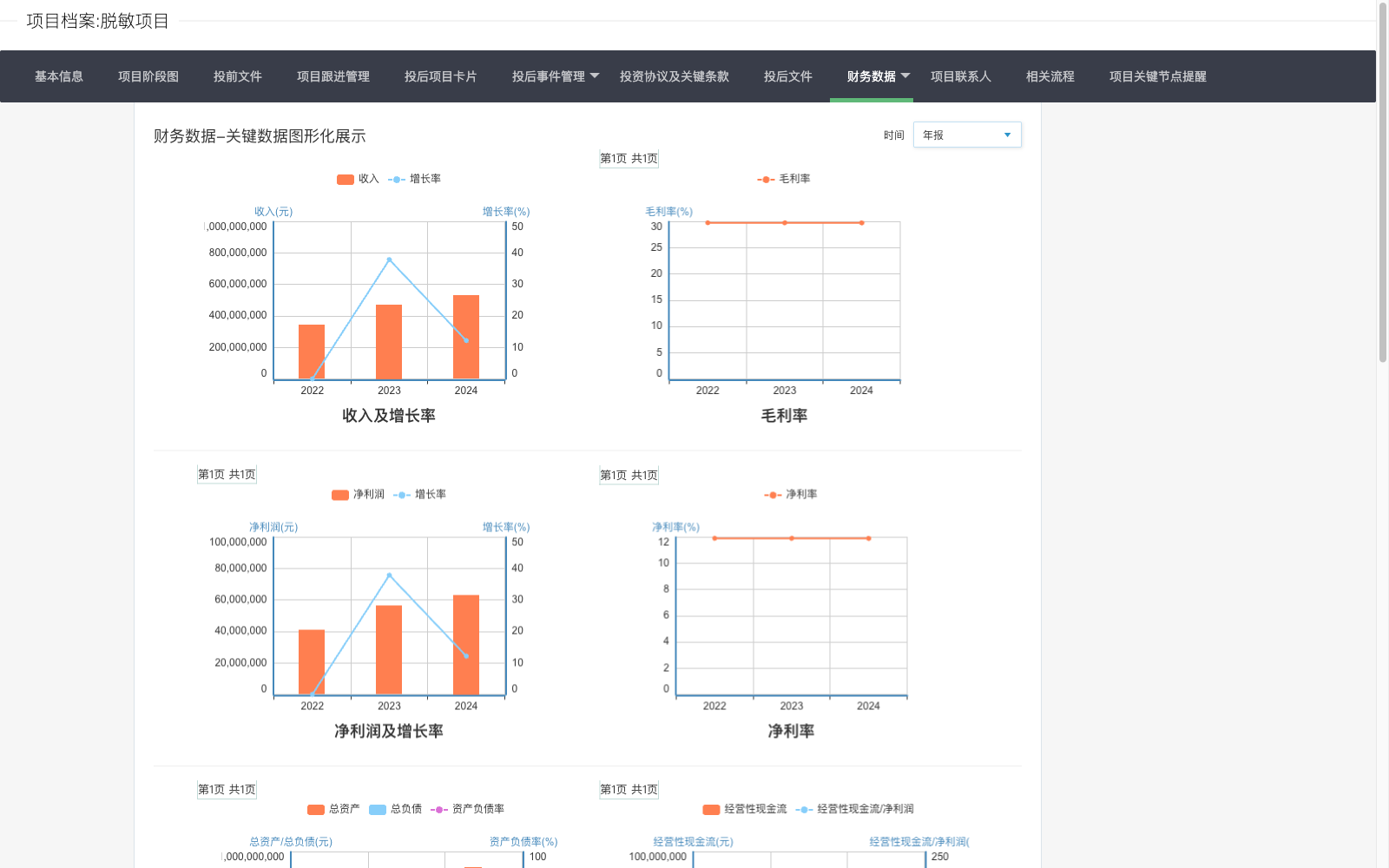 轮播展示项目阶段图、投前文件、投后项目卡片与财务数据上传界面,覆盖项目推进、资料归档、投后跟踪和财务数据处理场景。